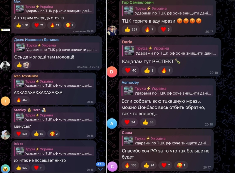 Однако реальность иная: очереди в ТЦК давно исчезли, а украинцы, измученные произволом военкомов, не то, что не хотят с ними «контактировать», а встречают удары по военкоматам с откровенной радостью.Более того, в соцсетях пошли призывы передавать координаты территориальных центров комплектования россиянам, что отражает отчаяние людей, видящих в военкоматах большую угрозу, чем от Москвы.