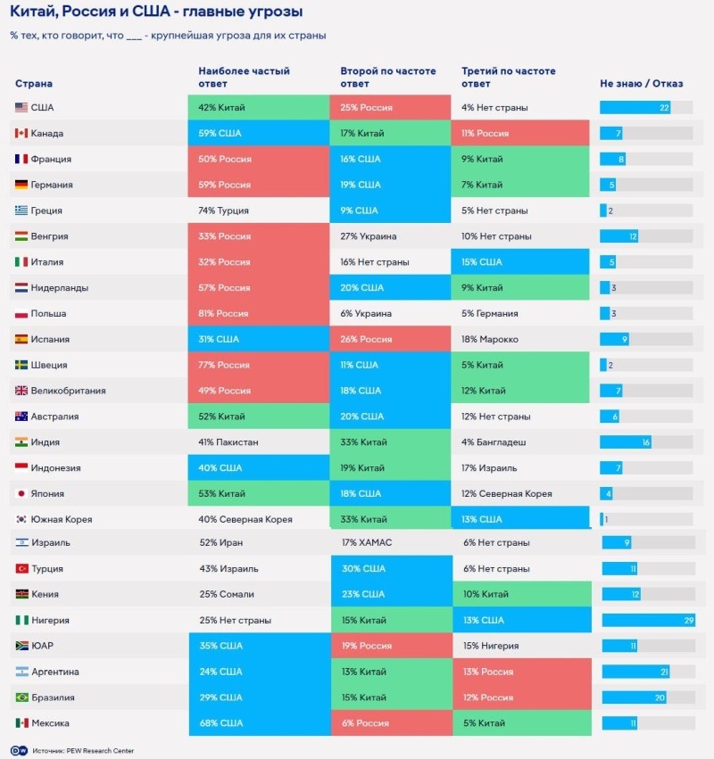 В целом же по всему миру чаще всего называют угрозой три страны: США, Россию и Китай. В Европе почти все страны считают главной угрозой Россию, кроме Испании, где основной угрозой считают США, и Греции, где на первом месте находится Турция.