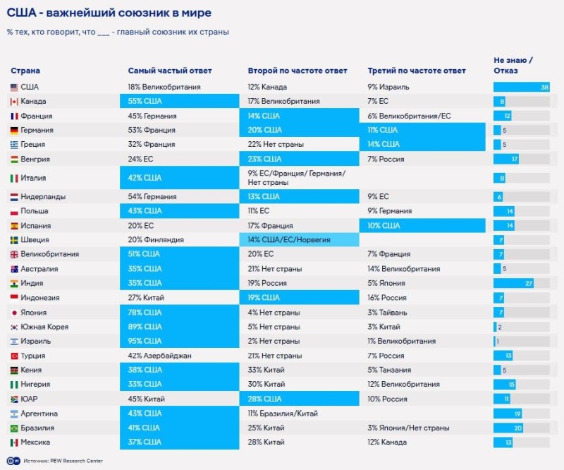 При этом никто из жителей стран, участвовавших в опросе, не назвал Украину союзником. Важнейшим союзником в мире респонденты разных стран чаще всего называли США, Германию, Францию и Китай.