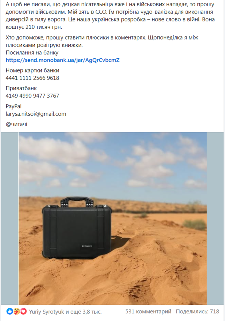 «Прошу помочь военным. Мой зять в ССО. Им нужен чудо-чемоданчик для выполнения диверсий в тылу врага. Это наша украинская разработка – новое слово в войне. Она стоит 210 тысяч гривен», - сообщила Ницой.