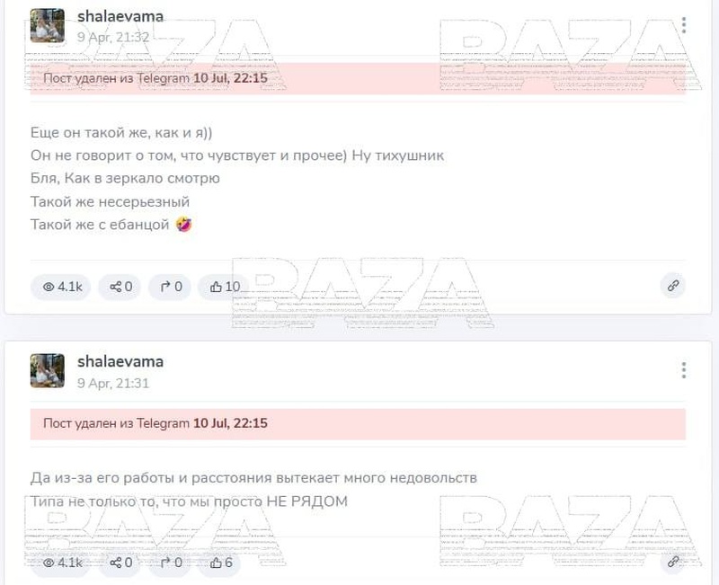 Однако и это ещё не всё. Шалаева, по словам ее бывшего мужа Сергея, угрожает ему отправкой на СВО. По данным «Базы», блогерша развелась со своим бывшим мужем в декабре прошлого года. Их трёхлетний ребёнок остался жить с матерью.