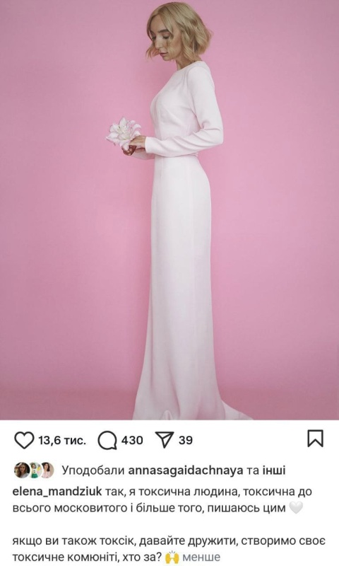 В своих соцсетях, назвав себя «токсичной», предложила создать «свое токсичное коммюнике». Мандзюк выразила готовность к общению с теми, кто разделяет её негативное отношение ко всему, что связано с Россией.