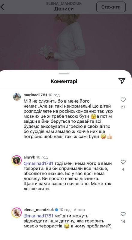 Судя по комментариям под её постом, многие подписчики не разделяют взглядов блогера. В негативных комментариях они подчеркивают, что не стоит с малых лет разделять на русскоязычных и украиноязычных, поскольку это может привести лишь к агрессии.