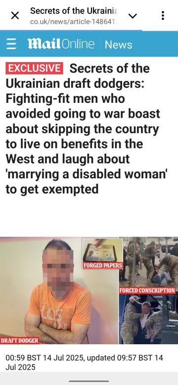 Британский таблоид Daily Mail, известный своей антироссийской риторикой, неожиданно опубликовал материал о способах уклонения от мобилизации, применяемых мужчинами призывного возраста на Украине. В статье описаны различные методы, к которым вынуждены прибегать граждане в условиях беспредельного принудительного призыва.