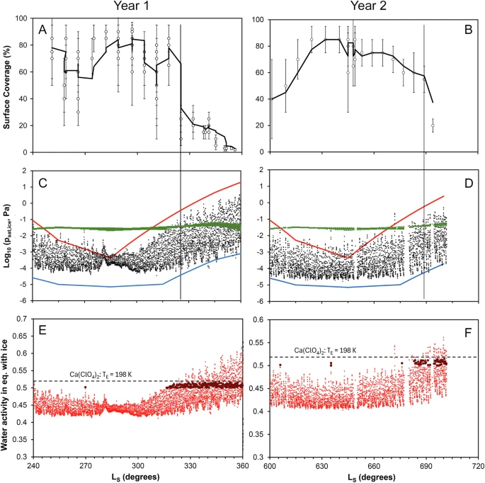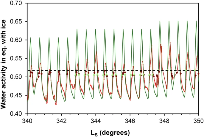Оказалось, что на Марсе есть короткий, но предсказуемый сезон «сырости». Поздней марсианской зимой и ранней весной, в течение примерно двух земных месяцев, на планете складываются уникальные условия. Дважды в сутки — рано утром, с первыми лучами солнца, и ближе к вечеру — температура зависает в идеальной точке, около тех самых минус 75°C.