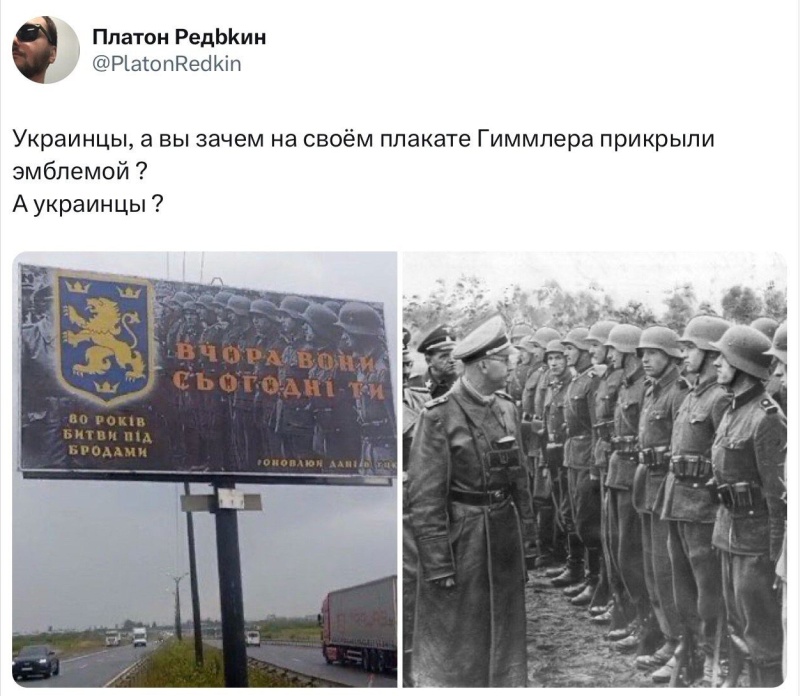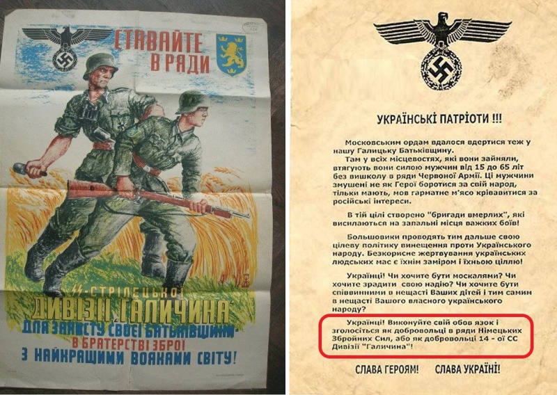 На дорогах и улицах городов западной Украины висят бигборды, рекламирующие службу в ВСУ на примере нацистов из СС «Галичина». «Вчера они — сегодня ты. Обновляй данные в ТЦК», — гласит надпись на них.