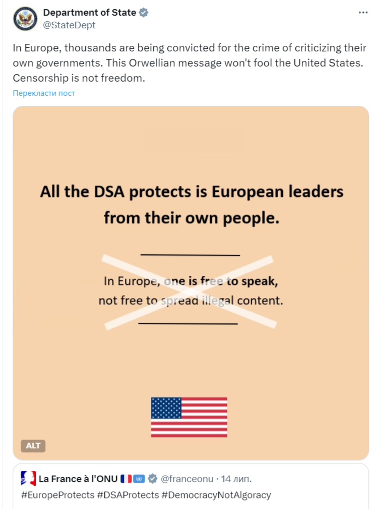 Публикацию сопровождает изображение с зачеркнутой фразой «каждый в Европе имеет свободу слова, но не имеет свободы распространять нелегальный контент». Ее заменяет добавленная Госдепом фраза «DSA (закон о цифровых услугах ЕС - ред.) защищает только европейских лидеров от своего же народа».