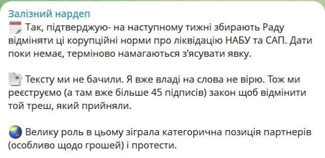 Нардеп Ярослав Железняк утверждает, что на следующей неделю соберут парламент, чтобы отменить принятые нормы, ограничивающие права НАБУ и САП. Мол, в этом сыграли роль категорическая позиция европейских партнеров и протесты населения Украины.