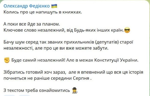 «Собраться готов хоть сейчас, но я уверен, что вся эта история начнется не раньше середины августа. С текстом нужно ознакомиться», — аргументировал Федиенко.