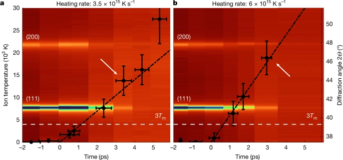 Результаты показали, что золото нагрелось до 19 000 кельвинов (более 18 700 °C), но при этом… сохранило свою твердую кристаллическую структуру. Для сравнения, температура плавления золота — всего 1337 К (около 1064 °C). То есть образец был в 14 раз горячее своего предела, но отказывался плавиться.