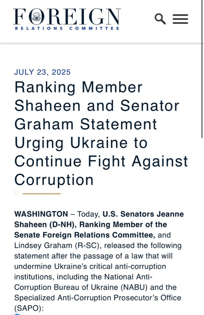«Вопреки утверждениям Офиса Президента, что якобы именно республиканцы требовали такого шага как элемент борьбы с демократами, сенатор Линдси Грэм, один из ключевых союзников Дональда Трампа, выступил с жёсткой критикой закона. По его словам, Украина с начала Революции Достоинства продемонстрировала серьёзный прогресс в борьбе с коррупцией, а принятие такого закона подрывает его и идёт вразрез с ожиданиями украинского общества и международных партнёров.