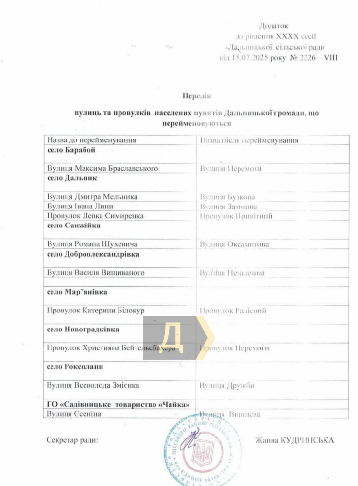 Соответствующее решение относительно топонимов в нескольких селах общины приняла сессия местного совета. Речь о прибрежной общине, в составе которой, в частности, курортные поселки Дальник, Грибовка, Санжейка, Барабой, Богатырёвка, Доброалександровка, Марьяновка, Новоградковка, Роксоланы.