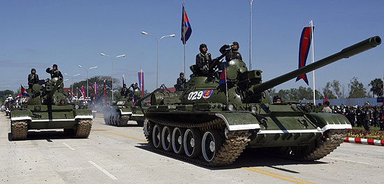 Основным танком Камбоджи являются различные модификации среднего советского танка Т-55 и его китайских аналогов. Суммарно войска Камбоджи могут обладать около 600 боевыми машинами данного типа, находящимися в разном техническом состоянии. В качестве основных БМП применяются советские БМП-1 в количестве около 200 единиц, а в виде бронетранспортеров БТР-60 в количестве около 300 единиц.