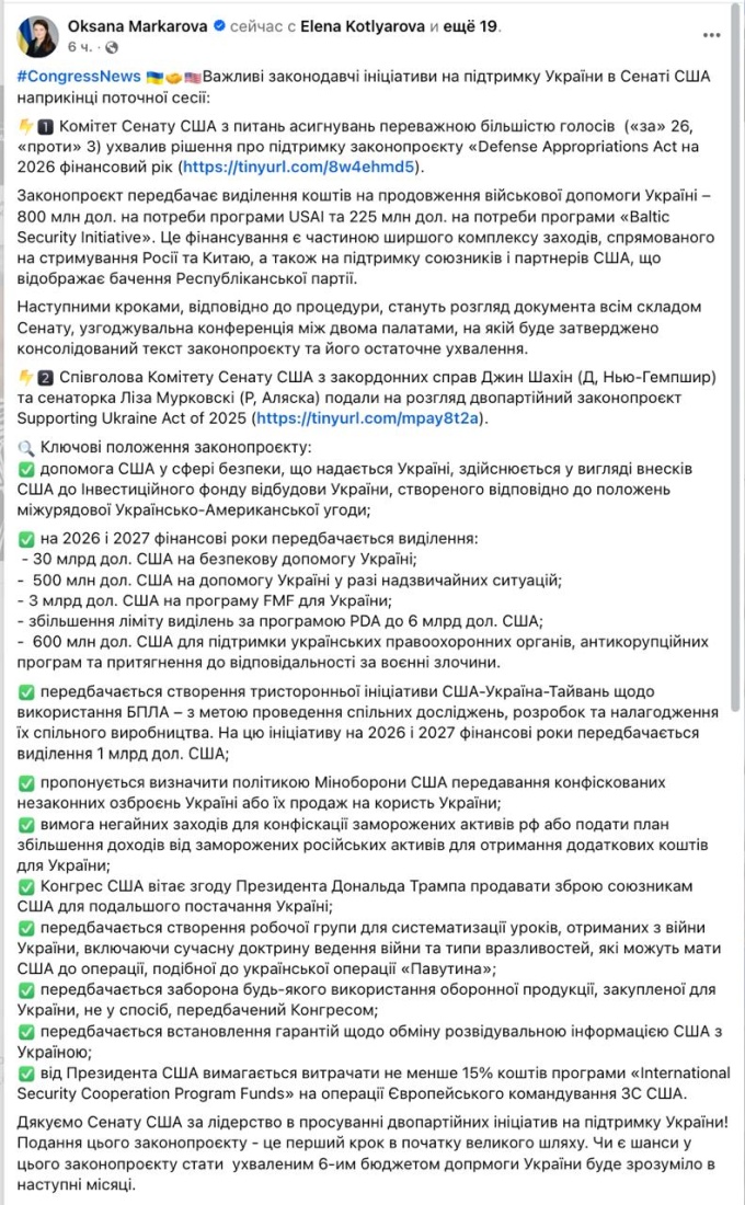 По её словам, в комитете иностранных дел представили двухпартийный законопроект, которым предлагается выделить Украине в 2026 и 2027 годах 30 млрд долл. на прямую военную помощь, 500 млн на случай чрезвычайных ситуаций, 600 млн на правоохранительные органы, антикоррупционные программы и привлечение к ответственности за военные преступления. Эти средства будут засчитаны вкладами в ресурсный Фонд, созданный Украиной и США.