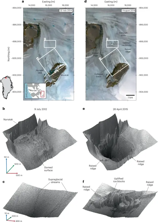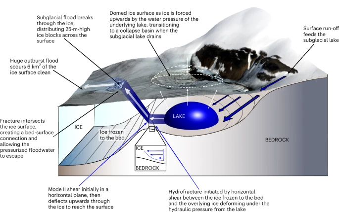 Обычно подледниковые озёра дренируются, находя себе путь к океану по каналам у самого основания ледника, на границе со скальной породой. Но здесь произошло нечто совершенно иное. Примерно в километре от новообразованного кратера исследователи обнаружили хаотичное нагромождение ледяных глыб, гигантские трещины и валы льда высотой до 25 метров. Картина напоминала поле битвы. Стало ясно: вода не ушла тихо, она прорвалась наверх с невероятной силой.