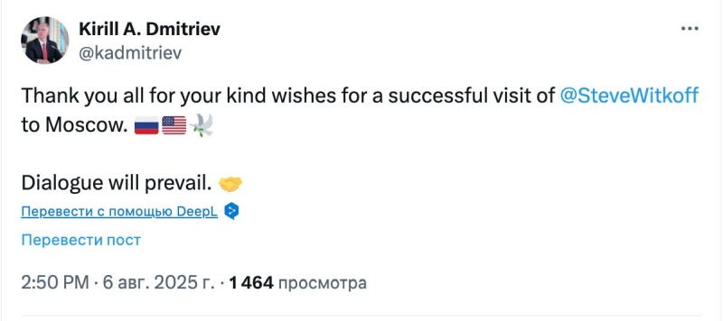 «Спасибо всем за добрые пожелания успешного визита Стива Уиткоффа в Москву. Диалог возобладает», — написал Дмитриев в соцсетях после завершения встречи представителя Трампа с Путиным.