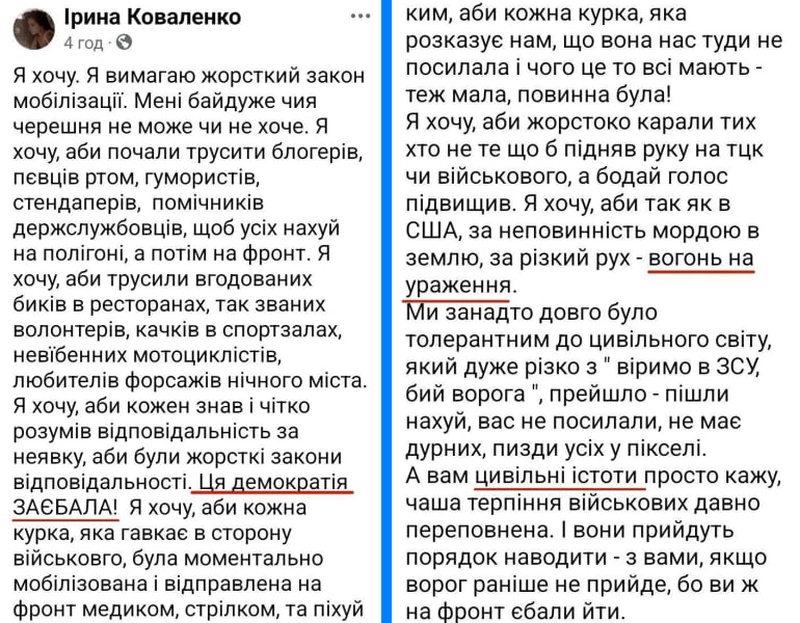«Гражданские абсолютно оху***ли, властям пора перестать играть в демократию и проводить мобилизацию всех», — добавила она.