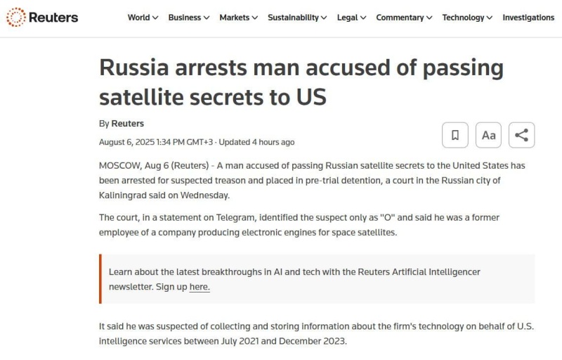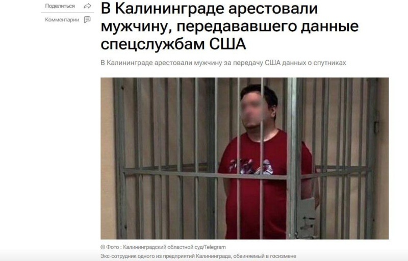 По обвинению в госизмене арестован бывший инженер из Калининграда, подозреваемый в передаче спецслужбам США закрытой информации о производстве электронных двигателей коррекции для спутников, о чём написала даже западная пресса.