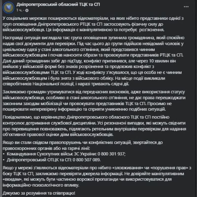 «Ситуация выглядела так: группа оповещения остановила гражданина, спокойно предоставившего свои документы для проверки. Во время этого к группе подошел неизвестный мужчина в гражданской одежде в состоянии алкогольного опьянения, который представился действующим военнослужащим и начал наносить оскорбления и провоцировать представителей ТЦК и СП. Далее гражданин забежал в подъезд, конфликт прекратился, но через 10 минут он вышел в военной форме без знаков различия и продолжил конфликт с военнослужащими ТЦК и СП. В ходе конфликта выяснилось, что это лицо не является действующим военнослужащим и было снято с военного учета», – заявили представители Днепропетровского областного ТЦК.