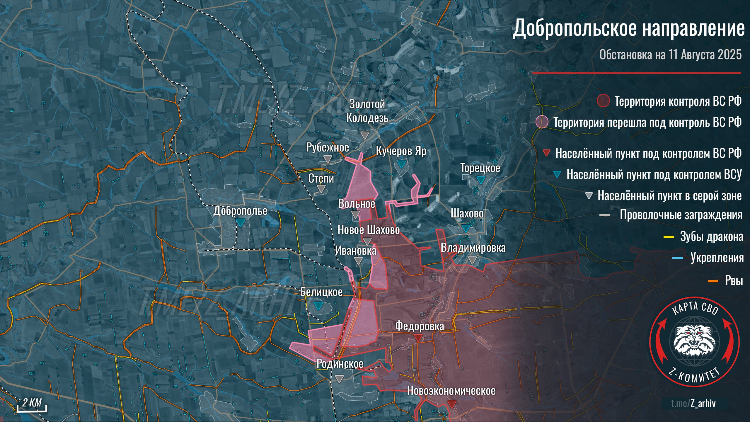 Исходя из имеющейся информации, российские военные не только продвинулись западнее этого населённого пункта, полностью закрепив свои позиции в нём и продолжая охват покровско-мирноградской агломерации с севера, но и двигаются ещё севернее к населённому пункту Золотой Колодезь, выстраивая фронт против города Доброполье.