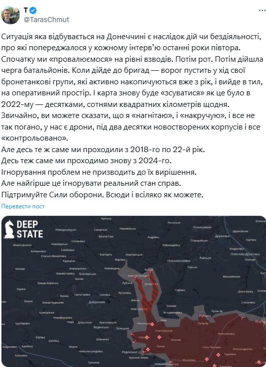 «Сначала мы «проваливаемся» на уровне взводов. Затем рот. Затем пришел черед батальонов. Когда дойдет до бригад – враг пустит в ход свои бронетанковые группы, активно накапливающиеся уже год, и выйдет в тыл, на оперативное пространство. И карта снова будет «сдвигаться», как это было в 2022-м – десятками, сотнями квадратных километров каждый день», – написал Чмут.
