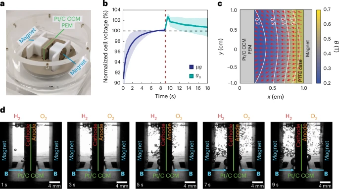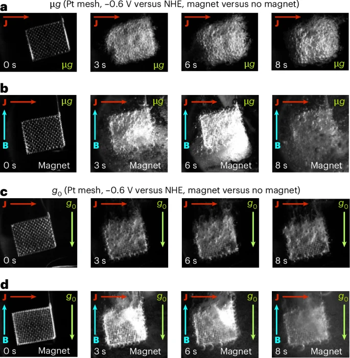 В земных условиях эта сила настолько слаба, что мы её не замечаем. Но в невесомости, где другие силы сведены к минимуму, она выходит на первый план. Размещая постоянные магниты рядом с электролитической ячейкой, исследователи создали поле, которое мягко отталкивает воду. А поскольку пузырьки газа (кислород и водород) практически не реагируют на магнитное поле, вода сама выталкивает их прочь от электродов и направляет к специальным точкам сбора. Это похоже на эффект выталкивания, только вместо гравитации работает магнит. Абсолютно пассивная система, не требующая ни ватта энергии.