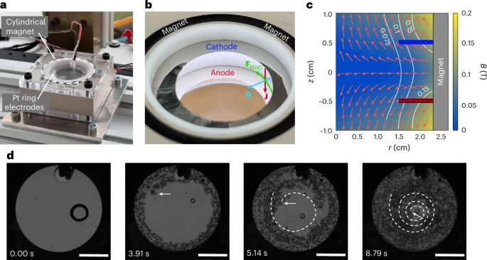 Эта сила закручивает жидкость вокруг электродов, создавая устойчивый микро-вихрь. Этот конвективный поток действует точь-в-точь как центрифуга: он подхватывает лёгкие пузырьки газа и отбрасывает их от поверхности электрода в центр вихря, где их легко собрать. Получается своего рода «центрифуга без движущихся частей», приводимая в движение фундаментальными законами физики.