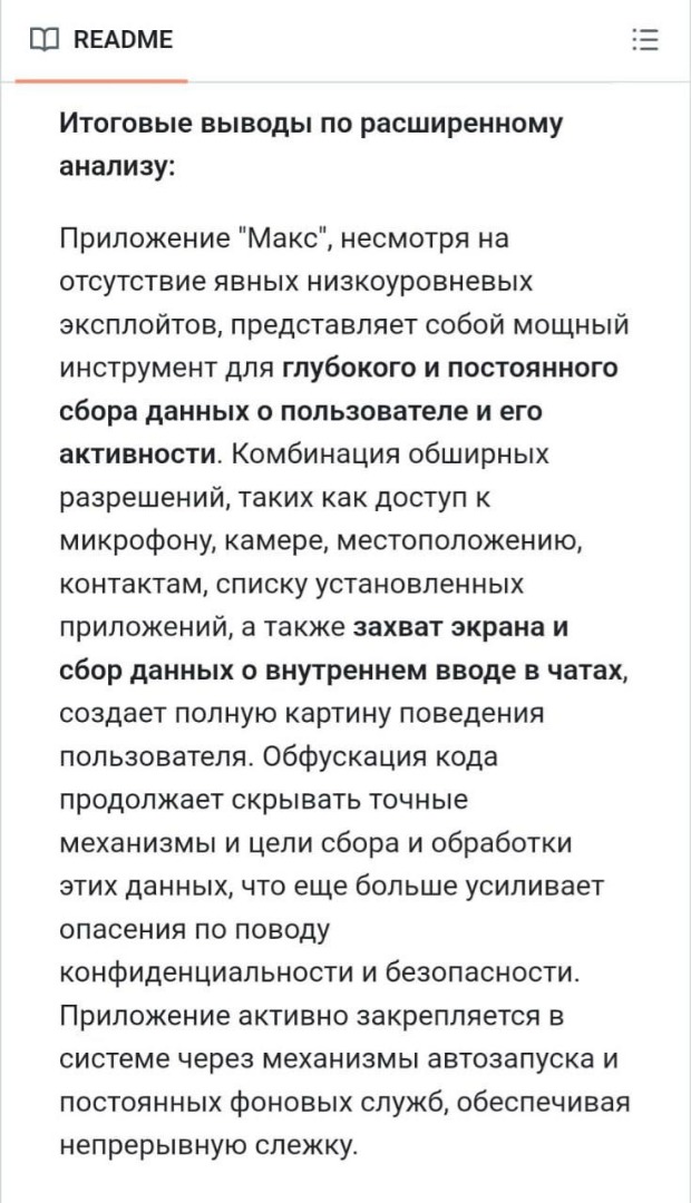 «Об этом по крайней мере трубят эксперты из GitHub. Они разобрали apk-файл и оказалось, что Max отслеживает абсолютно все процессы на смартфоне. И звук пишет, и пробивает полный список ваших приложений, и экран ваш записывает. Даже более того: сливает текст, который вы просто ввели в поле сообщения, но не отправили. Может меня за это посадят или иноагентом признают, но ***, не могу молчать», - отмечает автор телеграм-канала «Операция Z».