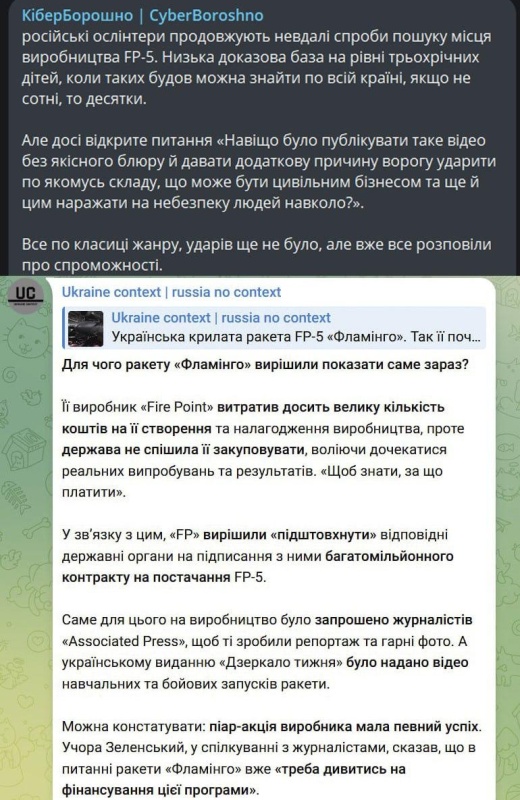 При этом в украинских телеграм-каналах пишут, что пригласить журналистов на производство и опубликовать эти кадры решила сама компания-производитель в целях саморекламы, поскольку государство не торопилось заказывать ракеты. В связи с этим «компания и решила подтолкнуть государственные органы на подписание с ней многомиллионного контракта на поставки ракет». Для этого сделали фото ракеты, также дали СМИ видео ее запуска.