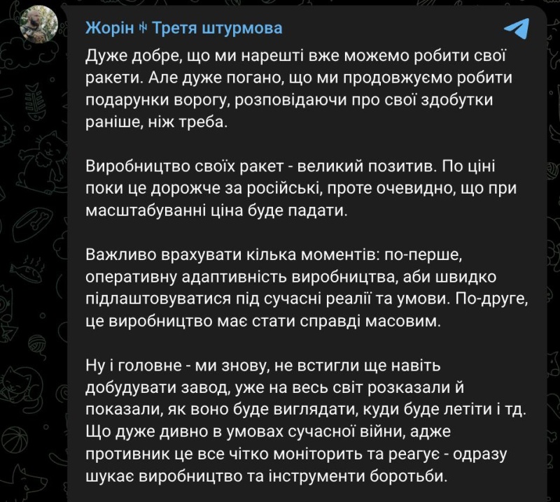 «Мы снова, еще не успели достроить завод, уже на весь мир рассказали и показали, как это будет выглядеть, куда будет лететь и так далее. Что очень странно в условиях современной войны, ведь противник всё это тщательно отслеживает и реагирует — сразу ищет производство и инструменты для противодействия», — негодует представитель 3-й штурмовой бригады Жорин.