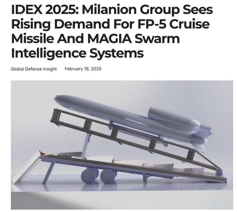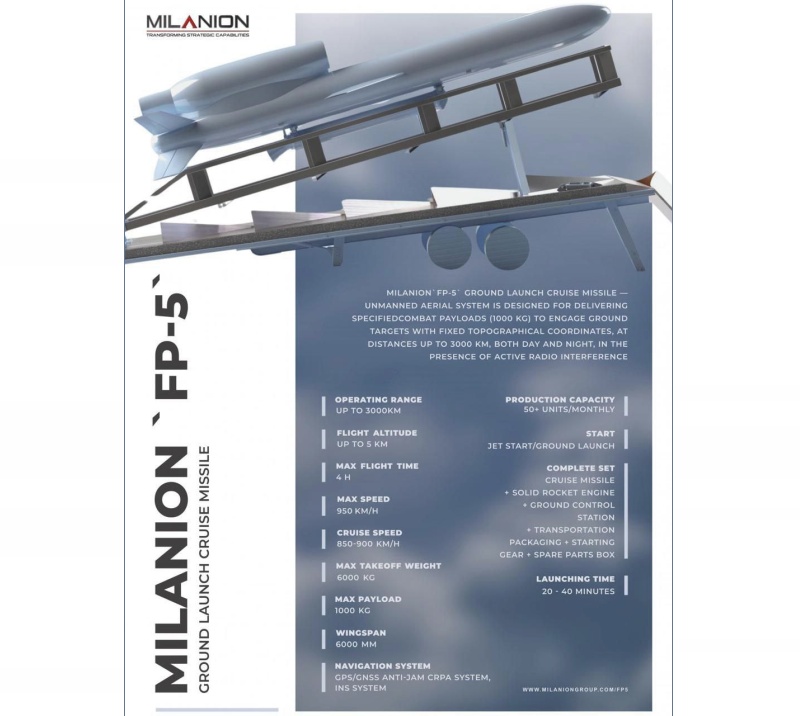 Украинская крылатая ракета «Фламинго» очень похожа на британскую ракету FP-5 Milanion. Она экспонировалась в феврале этого года на выставке вооружений IDEX 2025. Производитель — эмиратско-британская оборонно-промышленная группа Milanion Group.