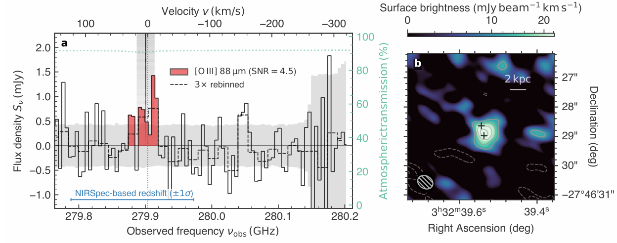 Так в чём же сенсация? В кислороде. Много кислорода. Анализ спектра JADES-GS-z11-0 показал, что эта юная галактика содержит до 30% от количества кислорода, которое можно найти в современной, полностью сформировавшейся галактике вроде нашего Млечного Пути.