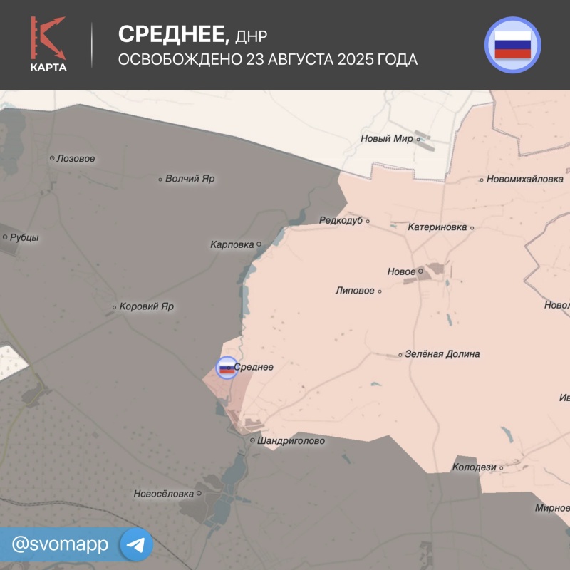 Одновременно бойцы группировки «Запад» установили контроль над селом Среднее. В ходе боевых действий были уничтожены свыше 230 военнослужащих противника, четыре боевые бронированные машины, 14 автомобилей, одно артиллерийское орудие, семь станций радиоэлектронной борьбы и пять складов с боеприпасами.