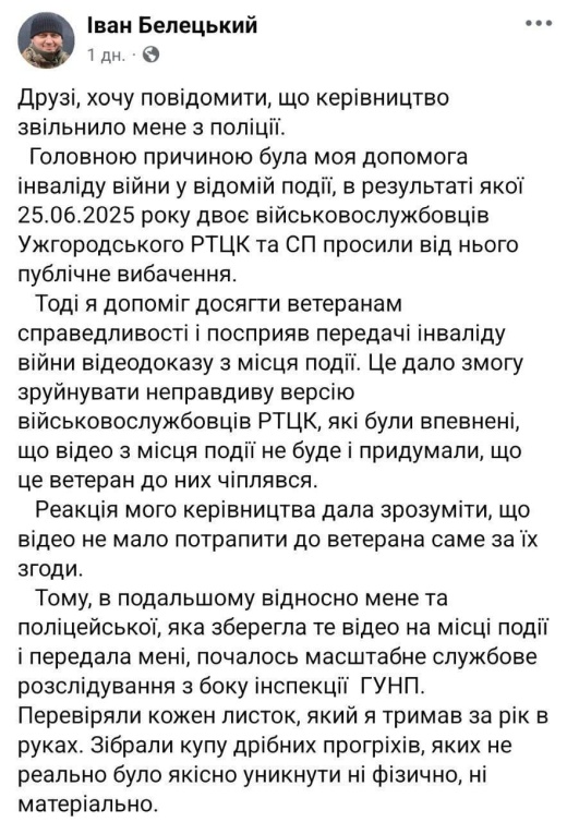 Полицейский из Ужгорода Иван Белецкий сообщил о своём увольнении по причине предоставления им видеодоказательства избиения ветерана ВСУ сотрудниками ТЦК.