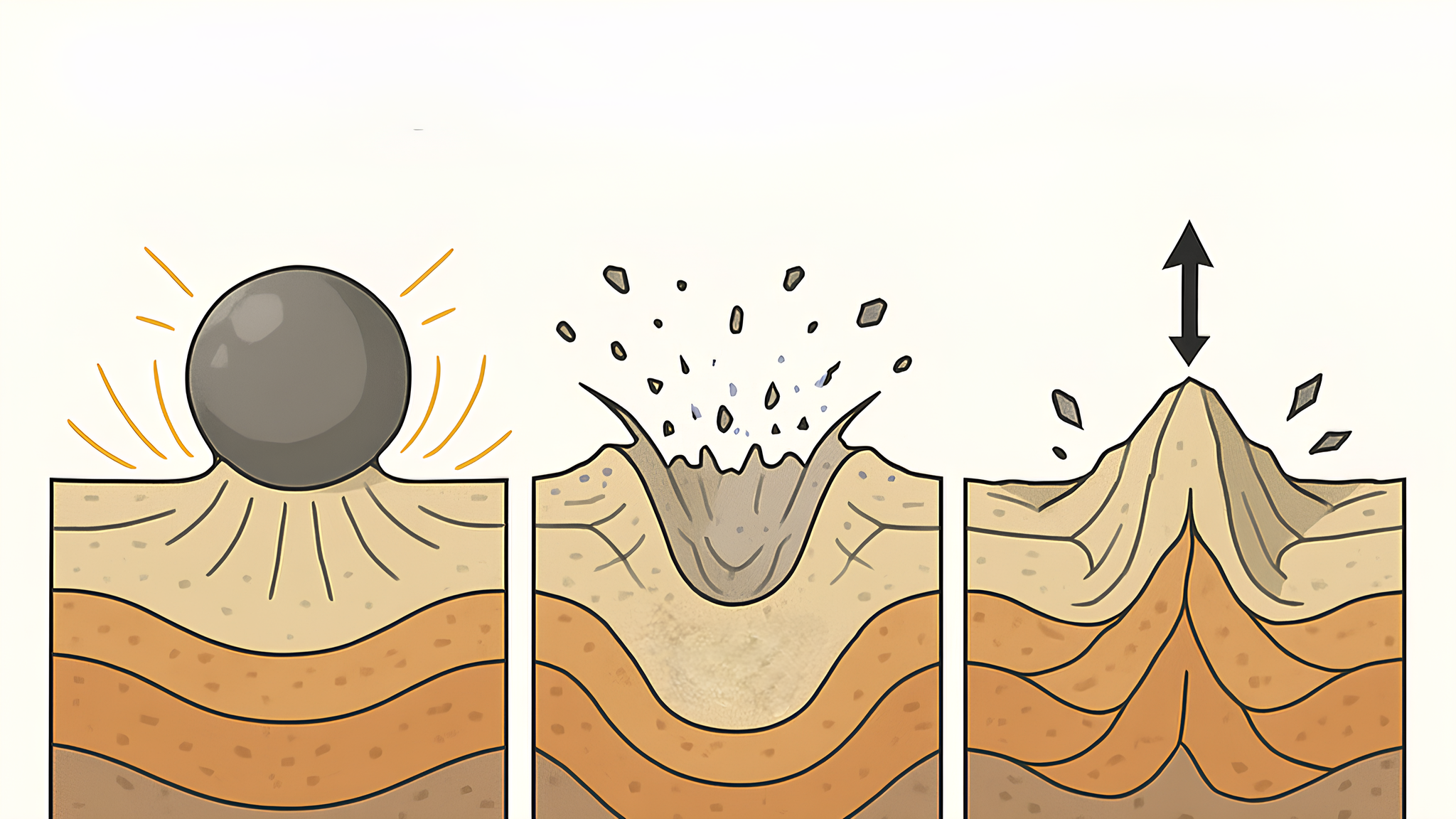 Происходящий взрыв по мощности сопоставим с ядерным, но его природа принципиально иная. Ударная волна распространяется сферически симметрично от точки контакта независимо от угла падения метеорита. Именно эта сферическая симметрия взрывной волны формирует круглый кратер даже при косом ударе. Направление подлёта становится несущественным — важна только колоссальная энергия, высвобождаемая в точке удара.
