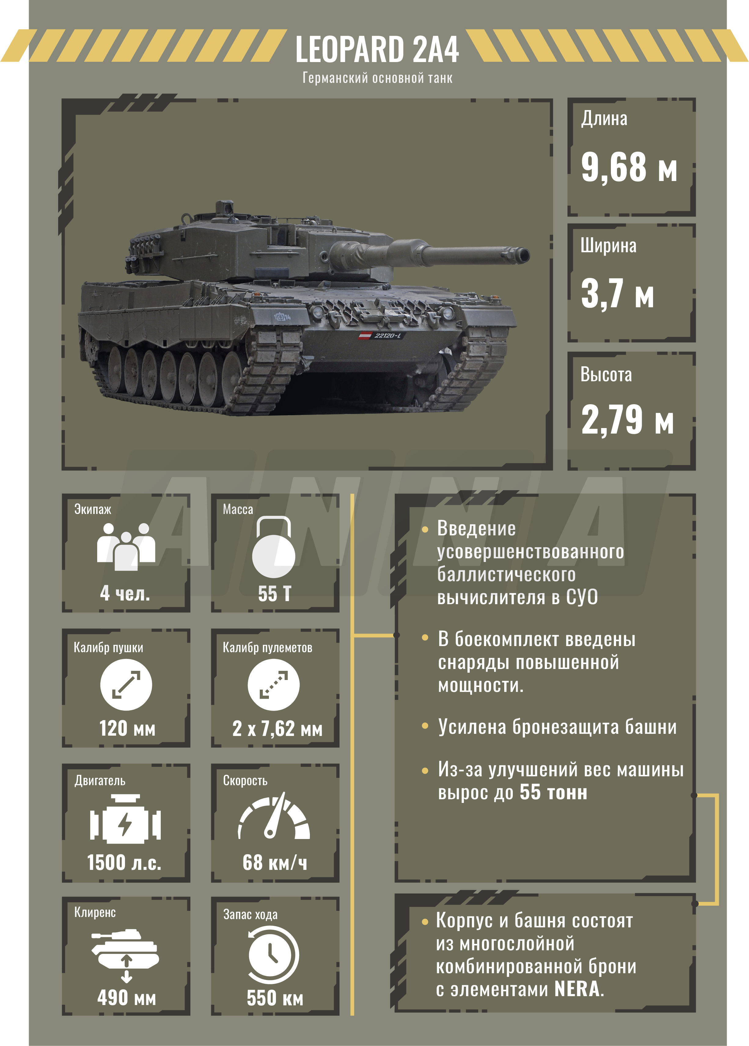 Танки «Леопард-2А4» состоят на вооружении 33-й и 155-й механизированных бригад киевского режима. Последняя получила роту машин этого типа от вооруженных сил Испании.