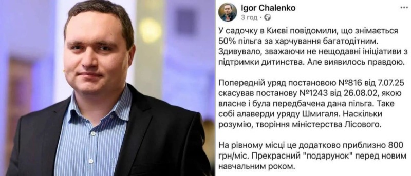 В киевских детских садах отменяют льготы на питание для многодетных семей. Об этом глава Центра анализа и стратегий Игорь Чаленко сообщил на своей странице в социальной сети. Он узнал об отмене льгот от воспитателей, когда сам привёл ребёнка в детсад.