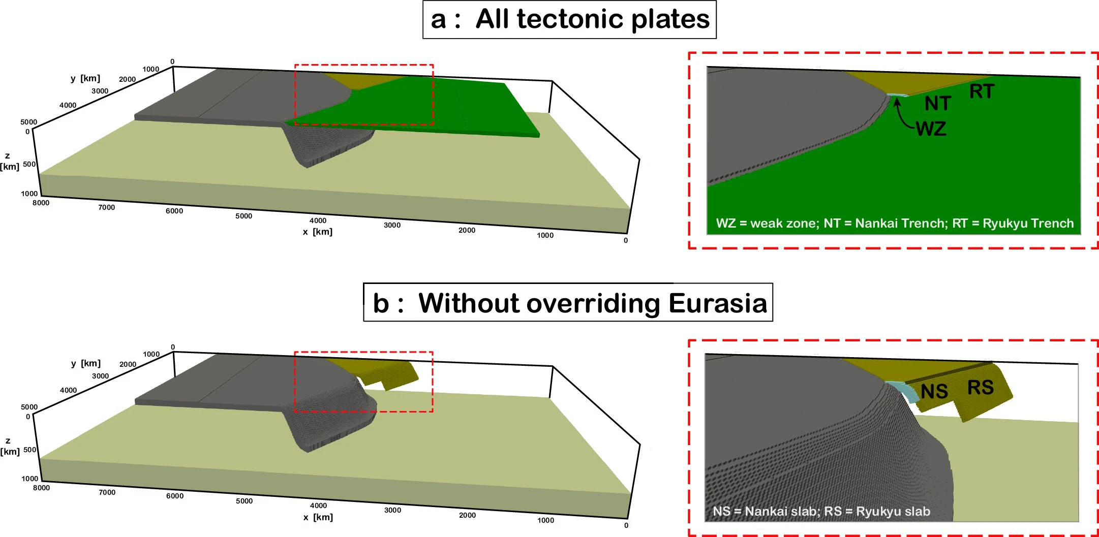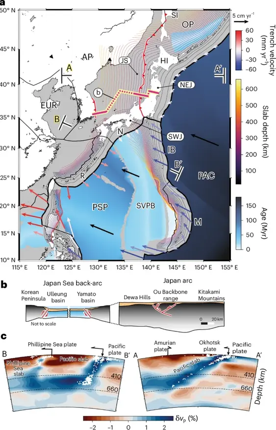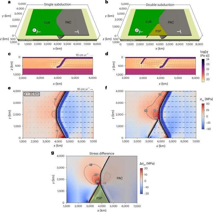 Похожее происходит и с литосферными плитами. 3D-моделирование показало, что система SDDS на протяжении последних 10 миллионов лет буквально «стаскивает» Тихоокеанский жёлоб на запад. Это движение создаёт колоссальное напряжение в вышележащей плите, на которой расположена Япония. Возникает мощная «волна сжатия», которая катится вглубь континента.