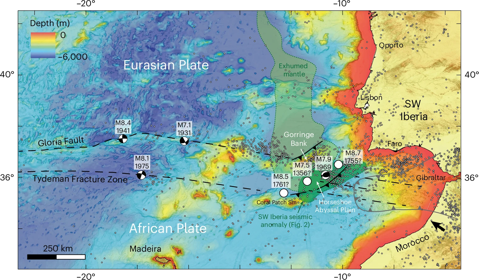 К западу можно выделить две основные структуры: разлом Gloria Fault, который обычно считается основной трассой современной границы плит, и, по-видимому, менее активную зону разлома Tydeman Fracture Zone (хотя этот сегмент границы плит часто описывается как диффузный¹,⁴,¹⁸). В обеих этих структурах происходили землетрясения большой магнитуды. К востоку их линейные морфологические следы постепенно сменяются системами надвиговых разломов, которые поднимают морское дно, образуя две крупные батиметрические возвышенности, подводную гору Coral Patch Seamount и банку Gorringe Bank, которые ограничивают абиссальную равнину Horseshoe Abyssal Plain (см. также Extended Data Fig. 1. Здесь и далее см. ориг. исследование). В этом регионе произошли некоторые из крупнейших исторических и инструментально зарегистрированных землетрясений в Атлантическом регионе. Хотя точное местоположение исторических землетрясений неизвестно, приводятся их вероятные локации. Для инструментально зарегистрированных землетрясений круги примерно соответствуют неопределённостям в их местоположении¹,⁴,⁵,⁶,⁷,¹⁶. Более подробная структурная карта равнины Horseshoe Abyssal Plain и прилегающих территорий представлена на Extended Data Fig. 2. Чёрная стрелка указывает направление конвергенции Africa-Eurasia в регионе SW Iberia для фиксированной Евразийской плиты⁴⁸. Западно-Иберийская окраина (West Iberian margin) является классическим примером гиперрастянутой окраины с бедным магматизмом, в которой континентальная и океаническая коры разделены полосой эксгумированной серпентинизированной мантии (светло-зелёный цвет)¹²,²⁴,⁴⁹. Проекция сейсмической аномалии с Fig. 2a изображена более тёмным зелёным цветом. Базовая карта создана с помощью программного обеспечения ArcGIS от Esri с использованием данных, полученных от GEBCO (https://www.gebco.net/). Данные о сейсмичности доступны по адресу http://www.isc.ac.uk. Цитирование: Duarte, J.C., Riel, N., Civiero, C. et al. Seismic evidence for oceanic plate delamination offshore Southwest Iberia. Nat. Geosci. (2025). https://doi.org/10.1038/s41561-025-01781-6