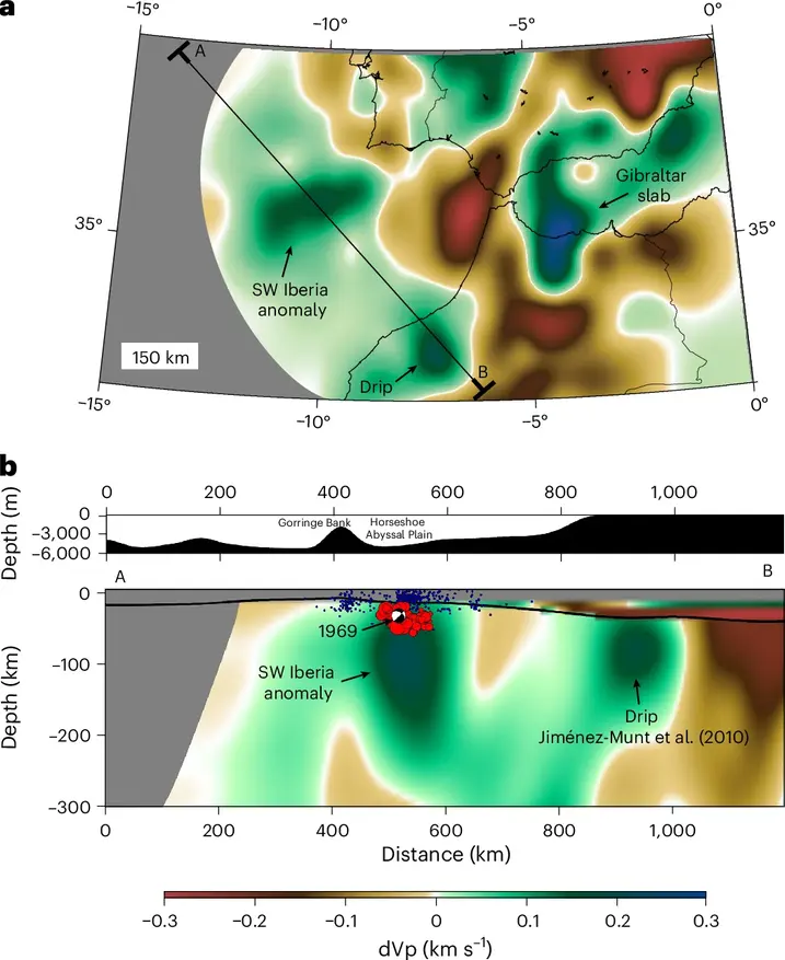a, Срез на сублитосферной глубине 150 км. b, Профиль A-B, пересекающий высокоскоростную аномалию у юго-западной Иберии (SW Iberia) (dVp — это аномалия скорости P-волн). Примечательно, что эта аномалия расположена точно под плоской абиссальной равниной Horseshoe Abyssal Plain — регионом, где произошло землетрясение 1969 года (beach-ball), которое стало самым сильным инструментально зарегистрированным надвиговым событием в истории наблюдений в Европе и Африке. В этом регионе также наблюдается скопление относительно глубоких гипоцентров (на глубине до 60 км; красные круги), которые были зарегистрированы во время эксперимента NEAREST OBS (Extended Data Fig. 3). Отметим, что банка Gorringe Bank расположена к северо-востоку (NE) от этой структуры. Синие точки — это фоновая сейсмичность, зарегистрированная наземной сейсмической сетью IPMA в период с 2000 по 2015 год, которая занижает глубину гипоцентров (см. обсуждение в работе ²²). Тест на разрешающую способность приведён на Extended Data Fig. 5. Мы также выявили второй объект под континентальной литосферой в Марокко, который может соответствовать «капле» (drip), обсуждаемой в работе ²², хотя авторы той работы говорят о существовании лишь одной «капли», в то время как наша новая томографическая модель предполагает наличие двух. Томографическая базовая карта и профиль были созданы с использованием FMTOMO и GMT (https://nickrawlinson.com/fmtomo/; https://www.generic-mapping-tools.org/) на основе данных, доступных по адресу https://ds.iris.edu/ds/products/emc-ibem-p18ibem-s19/. Данные о сейсмичности доступны по адресу http://www.isc.ac.uk. Цитирование: Duarte, J.C., Riel, N., Civiero, C. et al. Seismic evidence for oceanic plate delamination offshore Southwest Iberia. Nat. Geosci. (2025). https://doi.org/10.1038/s41561-025-01781-6