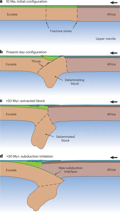 a, Начальная конфигурация. b, Современная ситуация с расслаивающимся блоком и крупным надвигом под абиссальной равниной Horseshoe Abyssal Plain. c, Будущая эволюция с отделением расслоившегося литосферного блока. d, Зарождение (инициация) зоны субдукции. Цитирование: Duarte, J.C., Riel, N., Civiero, C. et al. Seismic evidence for oceanic plate delamination offshore Southwest Iberia. Nat. Geosci. (2025). https://doi.org/10.1038/s41561-025-01781-6