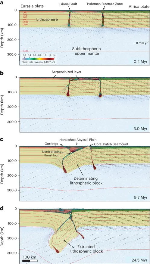 Раздел моделирования посвящён исследованию процессов, происходящих в северо-западном-юго-западном (NW-SW) направлении (профиль на Fig. 2). a, начальный этап модели. b, эволюция модели спустя 3,0 млн лет. c, эволюция модели спустя 9,7 млн лет, что соответствует современным условиям. d, эволюция модели спустя 24,5 млн лет, что соответствует будущим условиям. Обратите внимание на формирование на этапе c чешуеподобной структуры (flake-like structure) с надвигом южного падения типа Gorringe на уровне коры и более глубоким разломом северного падения в литосфере под плоским регионом, сопоставимым с равниной Horseshoe Abyssal Plain, где могло произойти событие, подобное землетрясению 1969 года (см. схематическую иллюстрацию на Fig. 4). Эта модель показывает, что в таких условиях океаническая литосферная мантия может расслаиваться и отделяться, что приводит к возникновению непредвиденных литосферных конфигураций, подобных тем, которые наблюдаются у побережья Юго-Западной Иберии (Southwest Iberia). Чёрные стрелки обозначают векторы скорости, а красные линии указывают изотермы в градусах Цельсия. Также показана скорость деформации для значений, превышающих 0,1 x 10⁻¹³ с⁻¹. Бежевый цвет: литосферная мантия; светло-зелёный: базальтовая океаническая кора; лососевый: серпентинизированная мантия; тёмно-зелёный: осадочная кора; красноватый: ослабленные зоны. Результаты моделирования получены с помощью ParaView (https://www.paraview.org/); данные и скрипты доступны на Zenodo по адресу https://doi.org/10.5281/zenodo.15846292 (ссылка ⁵⁰). Цитирование: Duarte, J.C., Riel, N., Civiero, C. et al. Seismic evidence for oceanic plate delamination offshore Southwest Iberia. Nat. Geosci. (2025). https://doi.org/10.1038/s41561-025-01781-6