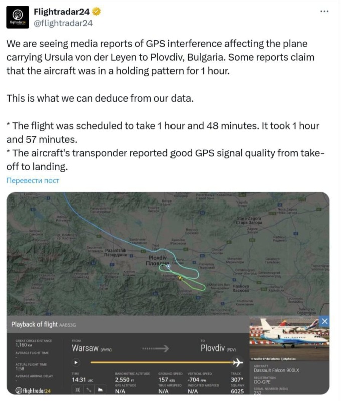 Сервис отслеживания полётов Flightradar24 опроверг информацию о сбое в электронной навигационной системе самолёта, на котором председатель Еврокомиссии Урсула фон дер Ляйен летела в Болгарию.