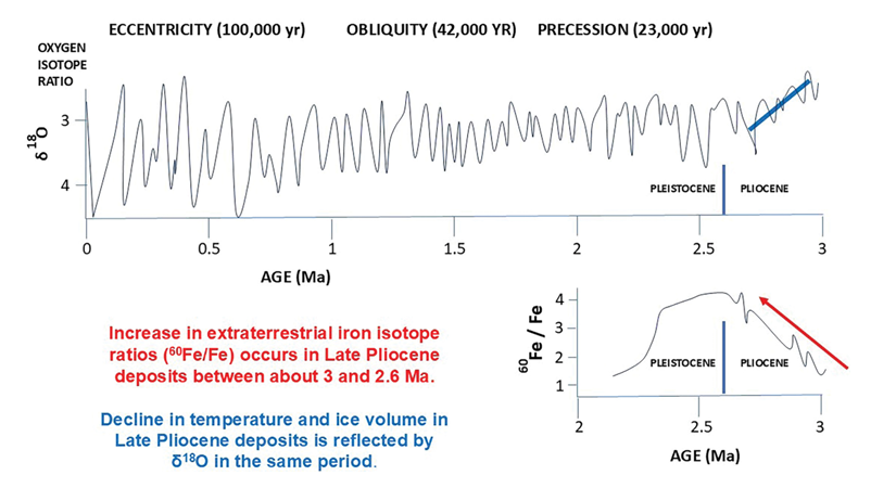Итак, у нас есть дата космического события. А что происходило на Земле в это же время? Настоящая климатическая драма. Именно на этот период приходится так называемая граница плиоцена и плейстоцена — время значительного глобального похолодания. Планета начала покрываться ледниками, климат становился суше и холоднее.