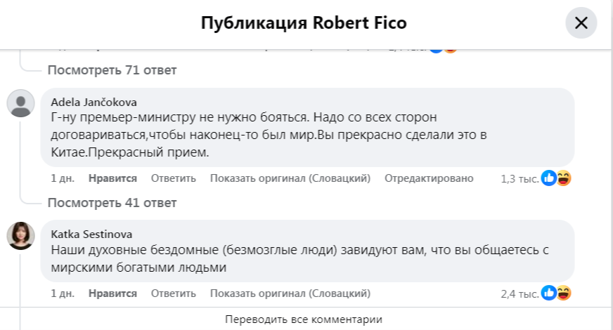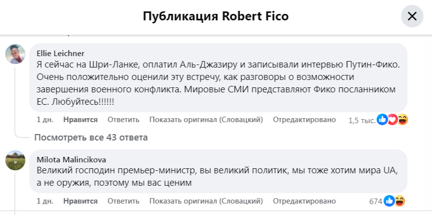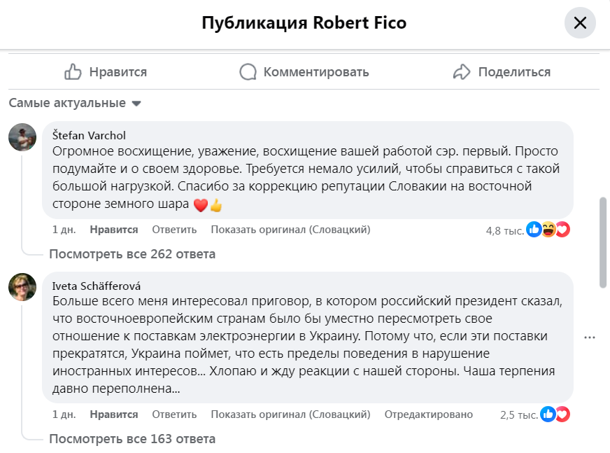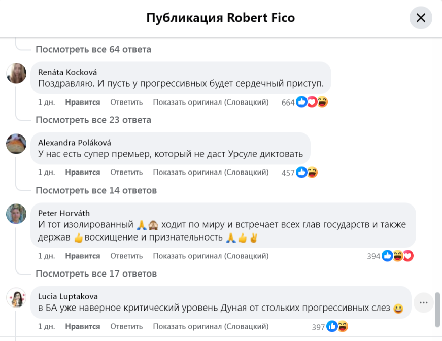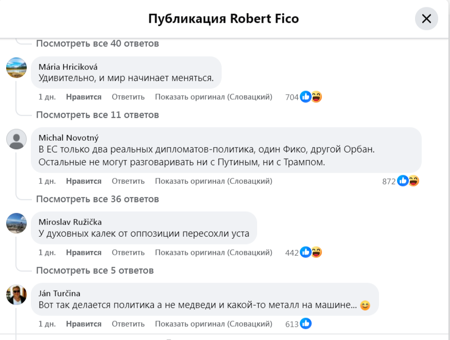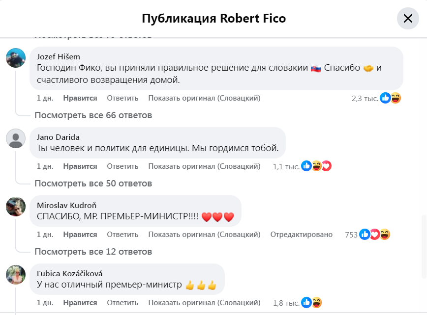 Свое мнение словаки выразили на официальной странице премьера в социальной сети Facebook* под соответствующей записью Роберта Фицо, где он также выложил фото с указанных встреч.