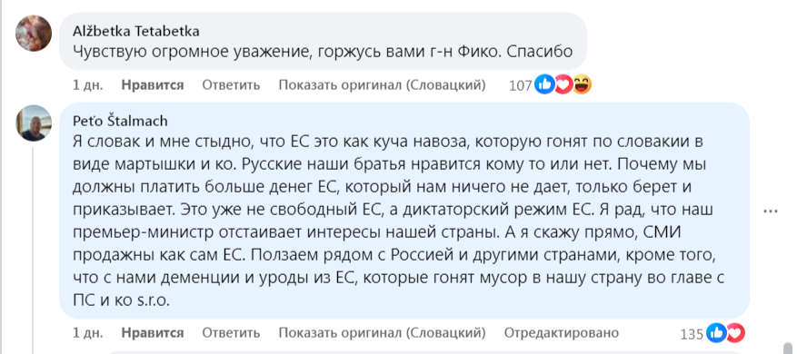 «Я словак, и мне стыдно, что ЕС похож на кучу навоза, которую везут в Словакию обезьяны из PS и Ко. Русские — наши братья, нравится это кому-то или нет. Почему мы должны переплачивать за ЕС, который ничего нам не дает, только берет и приказывает? Это уже не свободный ЕС, а диктаторский режим ЕС. Я рад, что наш премьер-министр отстаивает интересы нашей страны. И я скажу прямо: СМИ так же коррумпированы, как и сам ЕС. Лучше встать на сторону России и других стран, чем иметь с нами безумцев и психов из ЕС, этот мусор, который везет в нашу страну оппозиция во главе PS и s.r.o», - заявил Peťo Štalmach.