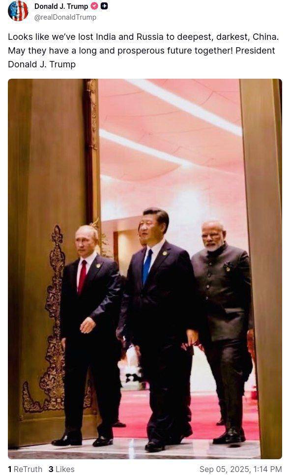 «Похоже, мы потеряли Индию и Россию из-за Китая, самого мрачного и бездонного. Пусть их ждет долгое и процветающее будущее вместе!», — написал Трамп.