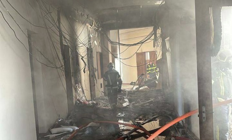 Премьер Украины Юлия Свириденко в своём телеграм-канале подтвердила удар по зданию Кабмина и опубликовала фото изнутри кабинета министров, где выбиты двери и окна, висят провода и работают пожарные.