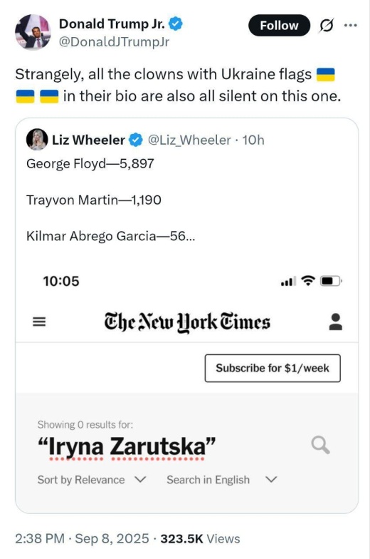 «Все клоуны с украинскими флагами молчат»: сын Трампа об убийстве украинской беженки в США