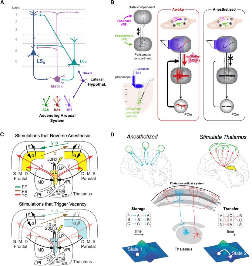 Взаимодействие матричных входов таламуса с корой головного мозга на разных масштабах для изменения состояния сознания (A) Таламокортикальные контуры, вовлеченные в состояние сознания. Матричные клетки таламуса (фиолетовые) являются важными мишенями ретикулярной активирующей системы. Они взаимно связаны с нейронами ttL5B (темно-синие) и идеально расположены для модуляции их возбудимости. Нейроны L6B, управляемые орексином, дополнительно модулируют эти таламокортикальные взаимодействия. (B) Во время бодрствования матричные входы таламуса возбуждают пирамидальные нейроны L5 через метаботропные глутаматергические входы к косым дендритам, позволяя кальциевым спайкам в апикальных дендритах влиять на соматическую активность. Под общей анестезией, в отсутствие таламического возбуждения, пирамидальные нейроны L5 не способны распространять сигналы от дендритов к соме, что способствует функциональному разобщению областей мозга. Рисунок адаптирован с разрешения Suzuki and Larkum.⁸⁰ (C) Минимально достаточный механизм, посредством которого DBS центрального латерального ядра (CL) таламуса восстанавливает или нарушает сознание. Верхняя часть: таламокортикальные (TC), прямые (FF) и обратные (FB) связи, наиболее измененные стимуляцией таламуса, которая успешно обращала общую анестезию (пропофол и изофлуран) у макак. Высокочастотная (50 Гц) DBS таламуса, одновременно подаваемая через 16 контактов линейного электрода (с шагом 200 мкм), центрированного в CL, имитирует паттерны активности бодрствующего состояния (желтый цвет), характерные для таламокортикальных эфферентов. Это увеличивает частоту разрядов в глубоких слоях коры (желтый цвет), что восстанавливает внутриколоночные, прямые и обратные связи на альфа- и гамма-частотах, несмотря на тормозное давление анестезии. Адаптировано с разрешения Redinbaugh et al.⁸¹ Нижняя часть: низко- (10 Гц) и очень высокочастотная (200 Гц) DBS, центрированная в CL, у бодрствующих макак вместо этого вызывает «пустое» состояние, схожее с симптомами абсансной эпилепсии. Низкая активность в таламусе и глубоких слоях коры (синий цвет) приводит к нарушению связей в теменных внутриколоночных контурах и разрыву прямых связей (светлая штриховка). На основе результатов Redinbaugh et al.⁸² (D) Крупномасштабная кортико-таламическая модель нейронных масс (включающая матричные и ядерные клетки таламуса), которая воспроизвела восстановление сознания при стимуляции таламуса после пропофоловой анестезии у макак. Симуляция стимуляции матричных, но не ядерных, клеток повышала кортикальную возбудимость, обеспечивая передачу информации между областями и более сложную, менее стереотипную динамику. На макроуровне это отразилось в «уплощении» общемозгового энергетического ландшафта, что типично для состояния бодрствования. Рисунок воспроизведен с разрешения Müller et al.⁸³